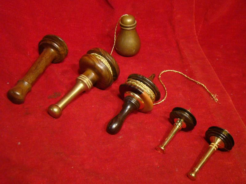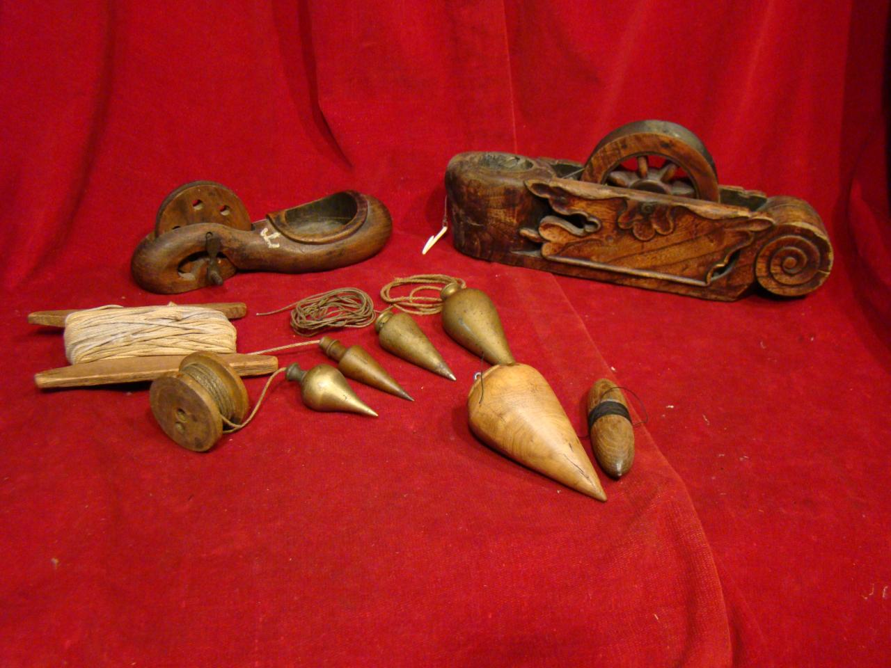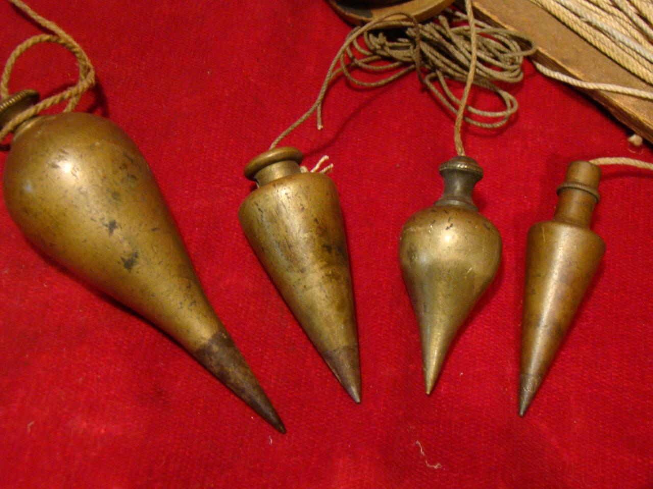 Shown also are a few vintage Plumb Bobs . Many of these were turned in the shape of staples of the day. Often are seen the turnip or onion , carrot or pear. The acorn was and still is today one of the most widely used decorations. The pineapple , symbol of welcome and friendship also seen among the early Plumb Bobs.